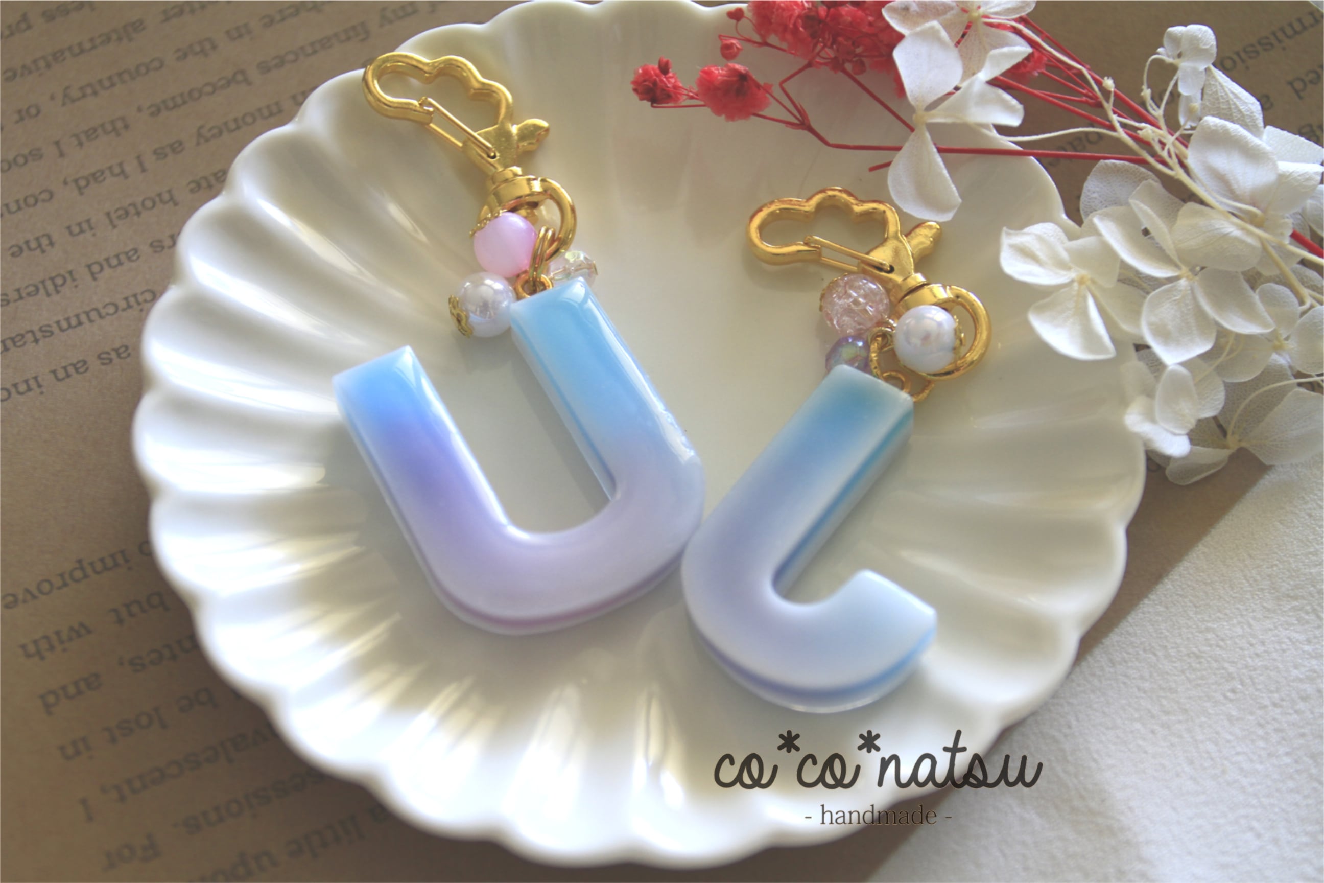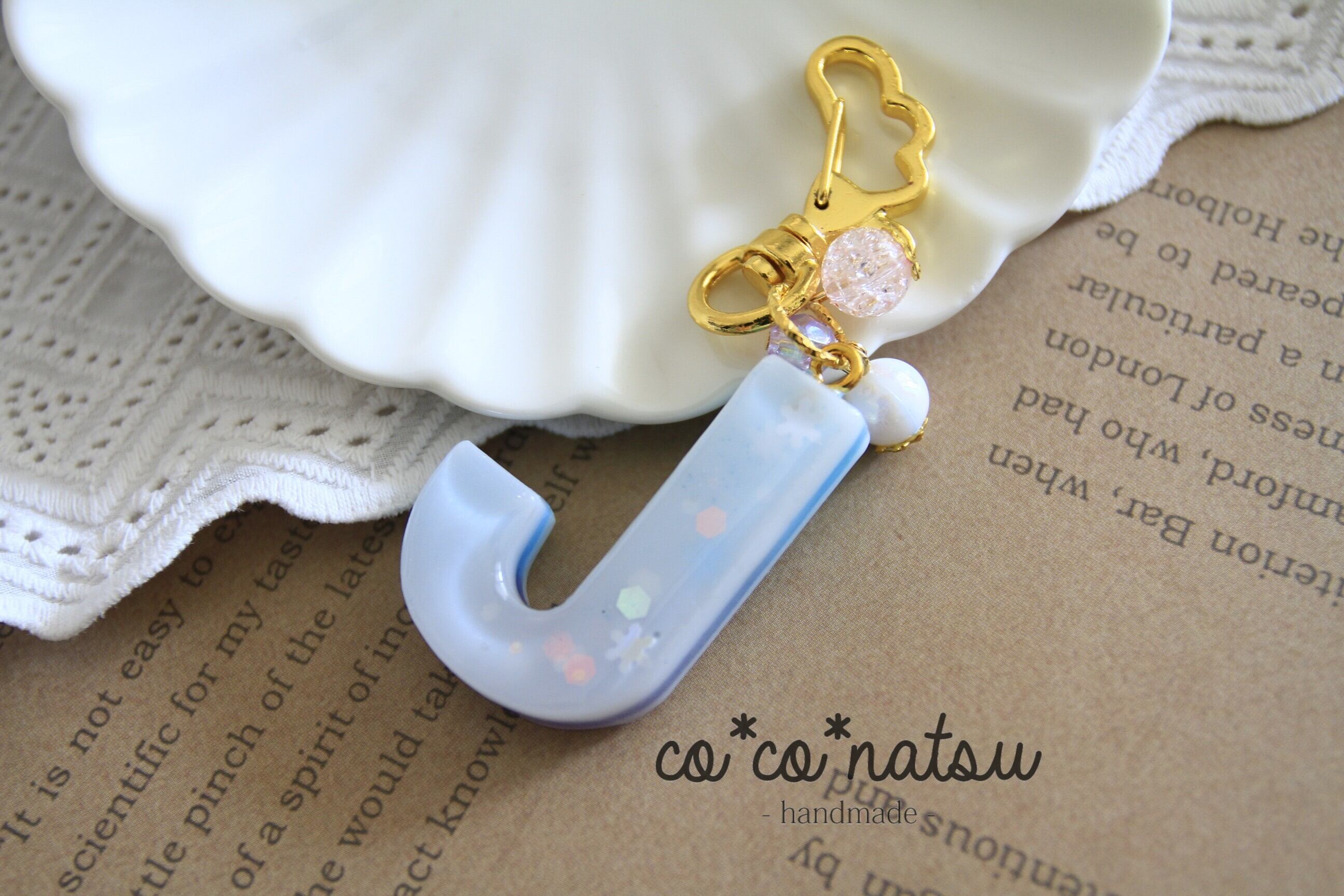 雪をイメージしたイニシャルキーホルダーです。